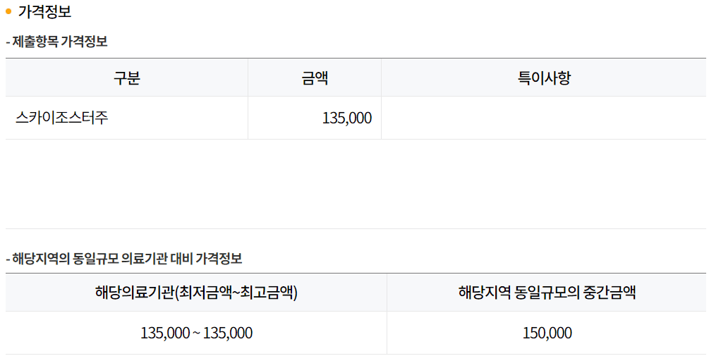 '가격정보' 탭에서 '세부' 버튼을 클릭하면 대상포진 예방접종료 정보를 확인할 수 있습니다. 선택한 지역의 동일 규모 의료기관의 대상포진 예방접종 중간 금액을 비교하여 저렴한 병원을 쉽게 찾을 수 있습니다.