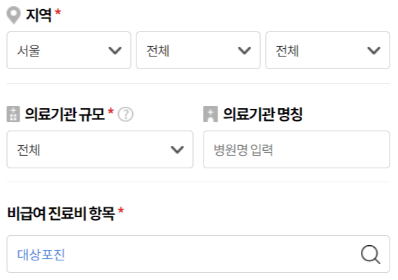 위에 버튼을 클릭하시면 아래 사진과 같은 사이트로 바로가기됩니다. '거주 지역'을 선택합니다. 비급여 진료비 항목에 '대상포진' 입력 후 상세분야 선택에 '예방접종료'를 선택한 뒤 하단에 선택항목 검색을 클릭합니다.