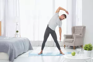 발을 어깨너비로 벌려 서서 한쪽 팔을 머리 위로 쭉 뻗는다. 천천히 숨을 내쉬면서 척추를 옆쪽으로 비틀어 옆구리를 늘린다. 30초간 유지한 후 천천히 원래 자세로 돌아온다. 반대쪽도 같은 방법으로 수행한다.